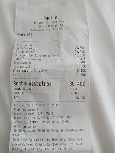 Café Amalie, für uns: NIE WiEDER! Wartezeiten von über 45 Minuten für ein Kaffee, 2 x Frühstück und ein Kaltgetränk. Für einen Kaffee evtl. ok (wobei man dafür auch mindestens 25 Minuten einplanen sollte bis man ihn lauwarm serviert bekommt!) aber für ein einfaches Frühstück über 40 Minuten Wartezeit ist definitiv zu lange. Es sind genügend Servicekräfte unterwegs aber die Theke/Küche kommt offenbar nicht hinterher, trotz halber Auslastung im Café. Wenn man die Kapazitäten nicht hat, muss man eben weniger Tische stellen. So vergrämt man nur die Kunden. Angebotene Backwaren (Brote) kommen von einem Bäcker aus Ludwigshafen, werden nicht etwa vor Ort selbst hergestellt. Wenn es interessiert, kann gerne weiterlesen: Waren zu zweit. Ein belegtes Brot und ein Frühstück bestellt. Getränkebestellung: ein Kaffee und ein Kaltgetränk. Kaltgetränk und Kaffee, die beide mit dem Essen bestellt waren (!!!), kamen nach 25 Minuten! Das dazugehörige Essen kam nach 20 weiteren Minuten, somit nach insgesamt 45 Minuten!!! Kaltgetränk mittlerweile warm, Kaffee kalt und somit ungenießbar. Laut Servicekraft hätten die Getränke und Nahrungsmittel nichts miteinander zu tun. Kaffee und Frühstück werden personell und zeitlich unkoordiniert hinter dem Tresen bzw in der Küche zubereitet. Daher kam der Kaffee und das Kaltgetränk nach 25 Minuten und die Frühstücke kamen nach 45 Minuten, daran könne nichts geändert werden, laut Servicekraft. Auf die Reklamation, dass der Kaffee mittlerweile kalt sei, wurde uns von der Servicekraft lustlos mitgeteilt, dass man das nicht anders organisieren könne. Wir baten um ein Gespräch mit der Chefin der Servicekraft, die uns das in gleicher Weise unengagiert und lustlos wiederholte. Auf die Idee, wie in einem guten Restaurant üblich, dass man einfach einen frischen Kaffee anbietet, kam von dem Personal niemand. Nachdem ich sagte, dass ich keine Lust mehr habe das Frühstück zu verspeisen, zu dem mittlerweile kalten Kaffee, hat man uns "beiden" das Essen vom Tisch weggezogen und uns somit quasi aus dem “RESTAURANT" hinaus "gebeten". Den Servicekräften und offensichtlich auch dem Management fehlt meines Erachtens jegliches gastronomisches Grundverständnis. Als Gast fühlt man sich hier wirklich nicht angemessen behandelt. Geschäftsidee scheint eher zu sein, mit den vielen Tagestouristen in Speyer schnelles Geld machen zu wollen, als dem Kunden zu vermitteln, dass er wiederkommen soll. Eine unterirdischere Behandlung in einem Lokal habe ich noch nie erlebt. Atmosphäre zum wohlfühlen fehlt, zu hektisch. Einrichtung ist pseudomodern. Lokal ist akustisch extrem laut und dadurch sehr ungemütlich, eine Unterhaltung fällt...