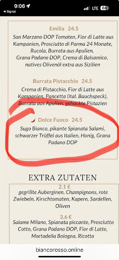 We heard from close freinds this establishment had excellent pizza, and offered to take us. We had a reservation and had to wait approximately 15 minutes. The restaurant is on a side street parallel to the Fußgängerzone in the center of Speyer… quiet, not an overwhelming amount of foot traffic and a nice location that is appropriately decorated to the Italian taste, indoor and outdoor dining areas. I’ve been on a limited carbohydrate diet due to type 1 diabetes and planned on having a salad. Then came the menu. The thought of a salad disappeared when I saw the magical word- Tartufo. Yes truffles, which I am an absolute sucker for. There are several choices of entrees that include truffles- pasta and pizza. The Dolce Fuoco pizza caught my eye due to the chilli pepper annotating spicy. I also love spicy food and frequently enjoy 150,000+ Scoville foods. So truffles and spicy definitely eased the decision. The appetizers were certainly appetizing, including the best sliced chorizo I’ve had. But the Dolce Fuoco was the absolute star of our table- in my humble opinion…. My wife also! There’s no tomato sauce on the pizza, thankfully, salami, Italian black truffles, honey and Grana Podano cheese which was sprinkled over the crust edges. I’ve been to Florence Italy and had delicious pizza there. But this pizza is the clear winner of any pizza competition if I’m the judge. Each individual ingredient can be identified in every bite, the mix is beyond excellent. I can’t say it’s spicy due to my love of ridiculously spicy foods, however it does have some pizzazz that solidifies the overall flavor experience. There were four different pizzas on our table that were all delicious, however the Dolce was the prized dish. I can’t recommend this enough, and look forward to...