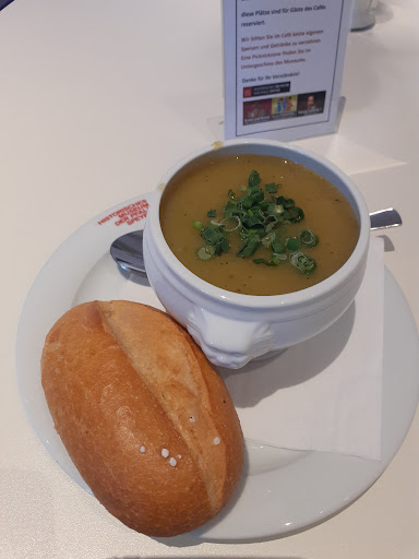 Ideale Einkehrmöglichkeit zur Stärkung vor oder zur Erholung nach einem interessanten Museumsbesuch. Auf diese Weise erspart man sich die Suche nach einem anderweitigen Lokal. 🙂 Weil ich die gastliche Stätte erst gegen 14 Uhr aufsuchte, gab's natürlich zwar keine so große Auswahl an warmen Speisen mehr. Deshalb entschied ich mich für die "Vegetarische Kartoffelsuppe" mit einem frischen Semmel. Eine sehr gute Wahl! Heiße und kalte Getränke werden in großer Vielfalt angeboten. Sehr höfliche und zuvorkommende Mitarbeiter! Toiletten auf neuestem Stand und absolut sauber, weshalb es 5...