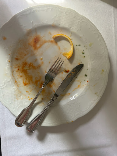 Aber nun zum Wichtigsten: dem Essen. Kurz gesagt – das war nicht nur lecker, es war so gut, dass mein Teller im Anschluss wie auf dem Bild aussah. Ja, das ist mein leerer Teller, als eindeutiger Beweis dafür, dass es richtig, richtig gut war. Keine Krümel mehr übrig, nur noch ein Zitronenstückchen, das tapfer bis zum Ende durchgehalten hat. 🍽️🍋