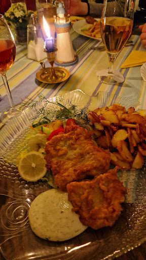 Wir waren absolut begeistert von den innerhalb kurzer Zeit in der kleinen Küche gefertigten Fischgerichte (Zander auf Kohlrabigemüse, Dorsch auf Spinat, Fischplatte mit Scholle, Dorsch und Kabejau, "Kapitänsteller" mit Räucherlachs, Matjesfilet und Krabbenrührei). Die Fischfilets waren perfekt gebraten und gewürzt, gleiches galt für die von uns jeweils gewählten Bratkartoffeln. Das Rührei war angenehm "fluffig", der Anteil frischer Krabben darin gut. Das Kohlrabigemüse und der Spinat waren von Konsistenz und Geschmack ebenso wie die hausgemachte Sahnesoße mit Gurken- und Zwiebelstückchen zum Matjes überzeugend. Die Salatbeilage bestand, für uns lobenswert, nur aus frischen Zutaten.
