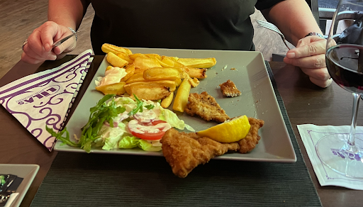 We started with the one of only two types of red wine on offer, being served in a chipped glass to me, and a glass with a previous customer's lipstick in two places, to my wife. This was rectified when we complained and two fresh glasses were duly brought. The wine itself then proved to be undrinkable. €3 for 5 litres from the bottom shelf of Kaufmanhaus? I ordered beer instead, my wife and daughter stuck with water, and we awaited the meal. The mozzarella and tomato salad, in a first-ever experience, appeared with pale yellow, thin slices of the grade of mozzarella cheese that you're more like to find grated onto a pizza or layered into a sandwich. Not the usual white, soft-interior bufallo mozzarella balls. And not with olive oil and balsamico but a salad dressing. The French onion soup offered was actually quite tasty, but a rather inique interpretation of a French onion and miso soup cross. All three of us ordered schnitzel, two of which the Wiener schnitzel. They were not great but to be fair, priced at half of what you'd expect to pay for a decent one, with generous quatities of fried potatoes. We were duly presented the full €100+ bill including the wines we had been unable to stomach and left. In 22 years of travelling to Germany, singly the worst meal we've consumed. Truly the epitome of cheap and...