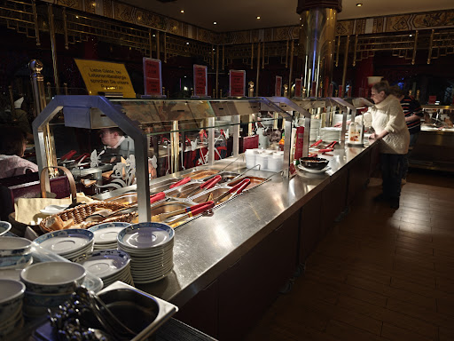 Schon der Besuch der sanitären Einrichtung ließ vage ahnen, was kommen würde: wirklich ausgefallen geplant, jetzt aber von der Verwahrlosung bedroht. Zeitnah zu unserem Eintreffen leerte sich das Restaurant, da offensichtlich das All-you-can-eat Buffet die Hauptattraktion ist. Die Speisekarte ist mit phantastischen Fotos illustriert, die Kinderspeisekarte gleichzeitig ein Ausmalbild (schade - alle Stifte waren abgebrüchen) und Gutschein für ein Eis. Die Gerichte sind das übliche China-Fertigessen, mit sehr phantasievollen Namen.