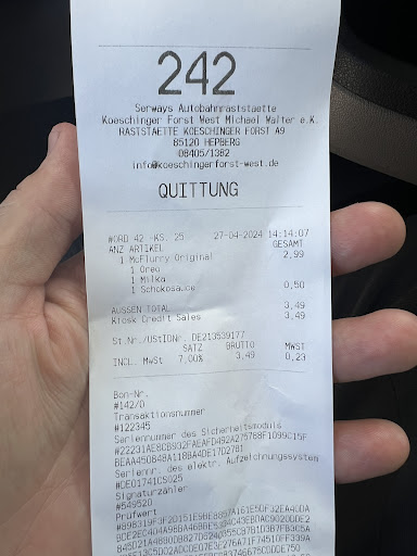 Sehr nette Mitarbeiter kann ich nur sagen und das Essen ist auch super im Gegensatz zu manchen andern Mc Donalds in der Stadt aber was mich extrem stört ist das wenn man auf die Toilette gehen möchte sich die Hände vorher zu waschen, muss man nochmals 1 Euro zahlen weil es nicht zum Restaurant anscheinend gehört was aber ein Witz ist da ich mir gern vorm essen die Hände waschen würde wie jeder normale Mensch !!! Wenn man wenigstens mit dem Kassenbon vom mc Donalds rein käme wäre das völlig in Ordnung aber so ist das lächerlich vom köschinger Forst Betreiber ! Vor allem 1 Euro zu verlangen ist schon lächerlich ! Versteh das geputzt wird und co und das kostet auch Geld aber ganz ehrlich wenn man so Gebäude mit Kasse für die tanke, verschieden. Restaurants und co baut wird ja wohl genügend eingenommen das man das mit dem Kassenbon macht oder wenigstens 50 Cent maximal zu verlangen aber 1 Euro ist ein Wucher und eine absolute Frechheit finde ich persönlich ! Wenn eine Familie mit drei Kindern kommt muss sie erst mal 5 Euro hinlegen um auf die Toilette zu kommen. Unglaublich einfach !!! Aber typisch deutsch kann...