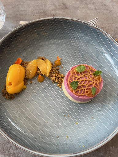 Der Abschluss des Menüs war ein wahrer Höhepunkt. Die Lavendelschnitte war luftig und hatte eine feine Lavendelnote, die nicht zu dominant war. Das Pistazien-Topping fügte eine angenehme Textur und einen nussigen Geschmack hinzu. Das Orangensorbet war erfrischend und brachte eine leichte Säure, die das Dessert perfekt abrundete.