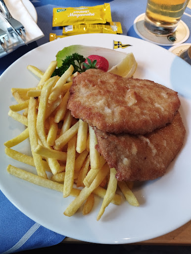 The food was good, no complains there. However, the menu was not available online, and when we arrived multiple dishes had been crossed of with a marker from some of the menus. Since the selection was already rather small, that left all of us to order the same dish: Schnitzel with potato salad and berry jam.
