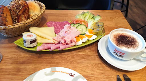 Wir hatten beide ein Käsefrühstück. Laut Speisekarte sollte es Brötchen nach Wahl geben. Das hatten wir leider erst gelesen, als der Brötchenkorb mit den billigsten Weißmehlbrötchen bereits auf dem Tisch stand. Bei der Bestellung waren wir nicht gefragt worden, welche Brötchen wir gerne hätten. Immerhin bekamen wir auf Nachfrage vier Brötchen unserer Wahl getauscht. Dafür fragten wir bei der Bestellung nach Hafermilch, die es laut Speisekarte im Angebot geben sollte. Leider keine da, war die Rückmeldung. Bei dem Frühstück sollte ein süßer Aufstrich dabei sein. Den bekamen wir auch nur durch Nachfrage. Was wir nicht empfehlen können, ist das Rührei. Das triefte vor Fett und...