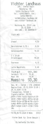 Read moreBesucht am 20.06.2014||Personen: 1||Grund: Abendessen||||Empfang & Service||Der höfliche Empfang der Servicemitarbeiter, welche einen äußert gepflegten Eindruck vermittelten, war während meines Aufenthalts durch deren professionelle Betreuung schon ein gutes Zeugnis des Hauses. ||Es war an diesem späten Nachmittag zwar bewölktes Wetter, ich wählte trotz drohendem Regen einen Platz auf der Terrasse, um das Rauschen der dem Haus umgebenden Bäume und den Gesang der Vögel zu genießen. ||Mein mich betreuender Mitarbeiter umsorgte mich, trotzdem ich der einzig mutige Gast auf der Terrasse war, hervorragend und aufmerksam, ungekünstelt und verstand es, mir Empfehlungen zu geben, wobei er mir jede Speise umfangreich zu beschreiben wusste.||||Die Speisekarte||Die ausgewogene Speisekarte bietet für Gerichte ab ca. 10,00 € und weist auch Vegetarisches als auch Seniorengerichte (minus 1,50€), und Kindergerichte aus. Neben der Standartkarte bietet das Haus seinsonale und besondere Gerichte und Menüs aus. Es gab sogar zur Fußballweltmeisterschaft eine originelle Karte, die Gerichte die mit den Namen der Fußballspieler der deutschen Nationalmannschaft bezeichnet wurden. Da fiel mir die Wahl doch recht schwer und daher ließ ich mich vom Service beraten. Damit hatte ich mir wohl Gutes getan denn, ich wurde mit dessen Empfehlungen nicht enttäuscht.||||Ich wählte zu und vor den Gerichten ein kleine Flasche Gerolsteiner Mineralwasser zu 2,00 €||||Schon vor meiner Order,||kam ein Körbchen mit frischen Weißbrotschnitten und mit einer feinen, cremigen Butter die mit Kräutern und einer leicht pfefferigen Note sehr gut mundete. ||||Ich wählte aus den Empfehlungen des Service||Vorspeise: Ziegenkäse im Serranomantel mit Pinienkernen, feinem Blattsalat, an ||Feigenvinaigrette und Feigenbrot zu 12,50 €||Hauptgericht: Filetsteak an Portweinjuse, Scampis, Böhnchen und Kurkumakartoffel||zu 27,50 €||Dessert: Erdbeerparfait, an Erdbeeren und eine Creme brüllet zu 6,50 €.||||Die Vorspeise ||Ziegenkäse im Serranomantel mit Pinienkernen, feinem Blattsalat an Feigenvinaigrette und Feigenbrot.||Sehr verführerisch angerichtet waren zwei, nicht zu kleine, leicht gebackene Röllchen vom Serranoschinken, gefüllt mit Ziegenkäse die mit Pinienkernen bestreut und einer Feigenvinaigrette überzogen wurden. ||Es überzeugte der cremige würzige Ziegenkäse mit den Pinienkernen, dem Serranoschinken, die herbe – nussige Würze des Rucola, die Süße der köstlichen Feigenvinaigrette und das dunkle Feigenbrot, welches auch noch Pinienkerne enthielt. Begeistert vom feinen Zusammenspiel der Komposition dieser Vorspeise, wartete ich neugierig nunmehr auf das Kommende.||||||Das Hauptgericht ||Filetsteak an Portweinjus, Scampis, Böhnchen und Kurkumakartoffelbrei||(Zu dem Hauptgericht wurde mir die kostenlose Nutzung der Salatbar angeboten. Ich nutzte das Angebot nicht weil, ich am Abend kaum Salat esse).||||Der schön dekorierte Teller, mit einem schönen Filetsteak an Portweinjuse mit gerösteten Pfefferkörnern, zwei im gebackenem Kartoffelnetz Scampis, an Kurkumma- kartoffelcreme, und feine Böhnchen ließ mich Gutes erwarten.||Das Filetsteak war butterweich und innen rosig, ohne blutig zu sein, und in Verbindung mit der feinen Portweinjus, den gerösteten Pfefferkörnern ein Zeugnis der hohen Küche.||Die beiden Scampis im Kartoffelnetzmantel ruhten auf einer zarten und fein abgestimmten Hummerbutter. ||Die leicht bittere milde Würze der Kurkumakartoffelcreme passte hervorragend zur Süße der leicht pfefferigen Portweinjus, die fein in Butter gegarten Böhnchen in Verbindung mit dem Ganzen, ließ es zu, dass diese Hauptspeise durch die Zutaten, hier vor Allem die Scampis, durch die Abwechslung meinen Gaumen überraschte.||Ich war so begeistert, dass ich dem Service ein großes Lob an die Küche aussprach. ||||Das Dessert||Setzte dem Ganzen die Krone auf.||Das feine Erdbeerparfait wurde so aufgetragen, als das es sich zwar eisig aber doch ohne Probleme mit dem Löffel aufnehmen ließ, (ich habe Parfait schon öfter zu stark gefroren serviert bekommen und zwar so, dass das Parfait er mir vom Teller sprang, mit Erdbeeren und einer im Töpfchen, welches mit Schokolade am Teller fixiert wurde damit es nicht wegrutschte (ein schöner Trick), Creme brüllet mit echter Vanille ||||Ambiente||Das äußerst gepflegte Restaurant und Hotel in der Eifel typischen Natur, weist ein gepflegtes Ambiente auf.||Große Fenster, schön gedeckte Tische, eine sehr gepflegte Terrasse, ein schöner Gartenbereich, gepflegte Parkplätze sind das Markenzeichen des Hauses. ||Hygiene||Vollkommen überrascht wurde ich durch die gepflegten WC-Räume, die sich wunderschön eingerichtet mit blitzenden, Fliesen, Becken und Spiegel, angenehmem Duft und sogar einem Körbchen mit frischen Gästetüchern präsentierten.||Gepflegter geht’s wohl kaum!||||Die Gäste, das Publikum||Aus dem In – und Ausland waren Gäste aus allen Gesellschaftsschichten anwesend.||Auch Gäste die im angeschlossenen Hotel verweilten und, wie ich vom Service erfuhr,|viele Gäste die aus Events, Feierlichkeiten und Firmenanlässen dort immer wieder gerne verweilen. Neugierig wie ich nun mal bin, und um ggf. Freunde aus Spanien die in Kürze zu Besuch kommen eine Unterkunft zu empfehlen, besichtigte ich abschließend das Hotel.||Modern und äußerst gepflegt präsentierte sich die Zimmer, der Empfang, der Frühstücksbereich mit Sitzplätzen auf den Balkonen.||Stolz sagte mir der Seniorchef: „ alle Zimmer sind mit Bad und TV, wir haben W-Lan im gesamten Haus und bieten für Firmen usw. komplette Konferenzausstattungen“.|| ||||||||||Der Küchenchef und das Team||Kreativität gepaart mit Sorgfalt und Liebe zum Detail , (ohne das Aufgesetzte einer so genannten „haute cuisine“ ), kann ich diesem Team nur bestätigen. ||||Preis – Leistung||Angesichts der erfahrenen besonderen Gaumenfreuden, der Qualität der verarbeiteten Produkte, ist der G