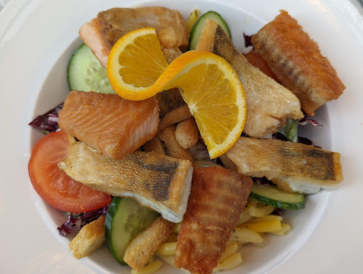 Klare Antwort zuerst: Nein, wir können dieses Restaurant nicht empfehlen. Wir müssen vor einem Besuch eher warnen! Wir haben das Haus am 20.07.2025 gegen 15.30 besucht. Wir hatten nicht reserviert, wurden aber freundlich empfangen. Wir haben eine Berliner Weisse, ein Hefeweizen und zweimal gebratene Forelle bestellt. Wir betonen an dieser Stelle: Es ist ein Fischrestaurant, spezialisiert also auf Fisch! Das Essen an den Nachbartischen sah ansprechend aus. So warteten wir gut gestimmt auf unser Essen. Es dauerte ein Weilchen, aber das ging für uns in Ordnung. Als die bestellten Gerichte kamen, sah es auch auf unseren Tellern sehr gut aus. Die ersten Bissen schmeckten auch gut. Übrigens sind wir Fischliebhaber und einen angerichteten Fisch fachgerecht zu filetieren stellt für uns kein Problem dar. Als ich mich zur Mitte der Forelle "vorgearbeitet" hatte, sah ich etwas kleines Weißes, das sich bewegte. Beim Abheben des nächsten Teils krabbelten munter eine Anzahl von Maden über den Fisch. Schlagartig war unser "Genuß" beendet. Ich stand auf, ging zum Thresen und sagte der Mitarbeiterin, die uns auch bediente, dass ich ihr etwas zeigen möchte. Wir waren trotz unseres Entsetzens gefasst im Ton und sind nicht in Schimpftiraden ausgebrochen. Die Servierkraft war offenbar ebenfalls geschockt, als sie die unbestellten Tierchen quicklebendig auf dem geöffneten Fisch sah. Ihr entfuhr (nur) ein:"Oh Gott..." Sie nahm beide Teller vom Tisch und verschwand damit. Sie kam nicht sofort zurück. Deshalb ging ich zu einer anderen Mitarbeiterin am Thresen und sagte, dass wir nur die Getränke bezahlen und sofort gehen möchten. Diese Mitarbeiterin antwortete, dass die Getränke auf's Haus gehen. Natürlich wissen wir, dass die Bedienungskräfte zuerst mit der Kritik und Konflikten in solchen Fällen seitens der Gäste konfrontiert werden, obwohl sie oftmals nicht für die Fehler, Fehlverhalten und Mängel des Küchenpersonals verantwortlich sind. Aber ...! Ein "Es tut uns leid." oder ein "Entschuldigung!" wäre das Mindeste gewesen. Das geschah nicht. Das Geschehene macht einfach nur fassungslos. Man muss nur mal versuchen sich vorzustellen was alles zuvor schief gelaufen ist bei der Zubereitung und Hygiene, bewusst, ignorierend, gleichgültig oder schlampig. Unbewusst ist in diesem Fall schlecht möglich, denn kämen die Fische zuvor aus dem Gefrierschrank, hätte es keine lebenden Maden gegeben. Der Fall ist schlichtweg unfassbar und eigentlich Grund genug das Haus überprüfen, im schlimmsten Fall schließen zu lassen. Hier darf eigentlich kein Stern vergeben werden. Ohne diesen ließ sich diese Rezension aber...
