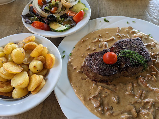 Zu den Speisen - nicht besser als eine Kantine. Die Schnitzel waren aus der Packung, noch dazu in einer miserablen Qualität (keine ordentliche Panade), die Soße (Champignonrahm) sowas von dünn, die Pilze aus dem Glas. Salat mit einem nicht beschreibaren Dressing angerichtet. Die Flasche Wasser Gerolsteiner (REWE 85-95 Cent) wurde uns für 6,70 Euro (!) verkauft. Schade!