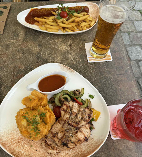 Currywurst with fries was basically swimming in ketchup, general experience worse than a street kiosk. Chicken had bloody uncooked parts (not to mentioned over-seasoned), tomatoes perished, some vegetables burnt. We did not finish our food.