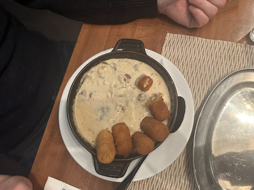 Read moreDas Preis-Leistungsverhältnis passt leider gar nicht. Moussaka bestand fast ausschließlich aus krümeligen Hackfleisch mit stark gebräunter Béchamelsoße, Auberginen und Kartoffeln waren nur beim letzten Bissen zu finden. Das Filet-Pfännchen bestand aus Schweinefilet mit einer pampigen Sauce, die einfach nur nach Mehl geschmeckt hat. Enttäuschend war auch der Beilagen-Salat, der mit einem geschmacklosen und wässrigen Dressing serviert wurde. Die Vorspeise aus mit Tomaten und Käse überbackenem Knoblauchbrot und Champignons war in Ordnung.
