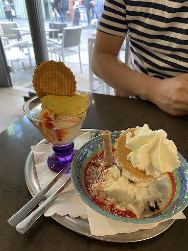 We ordered ice-cream and coffee, but when we sat at the table inside, we were informed that it was not allowed to eat ice-cream at the table, although we had also ordered coffee and nobody had asked us if we wanted it on site or for take away! At the same time, many other clients were eating their ice-cream at the tables outside and nobody was telling them anything. We sat inside because the only free table outside had not been cleaned yet. Moreover, a lady who was sitting at the table next to us, suddenly came to us and started saying to us something in German we couldn't understand, and we could smell she was drunk! I also saw an employee shouting at another group of clients. This was my 84-year-old grandmother's first trip to Germany after the year 1989 and we wanted her to have the best impression. Unfortunately, because of this negative experience her trip started badly. I know someone will probably answer explaining the coffee shop rules, but I honestly don't care, I don't like military rules when I'm on holiday and fortunately there are so many coffee shops to choose from. Never going to...