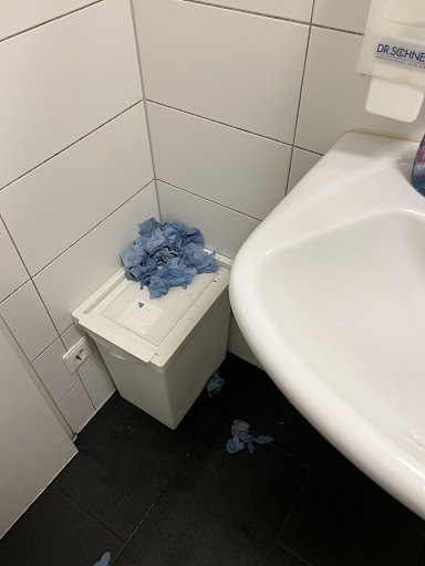 Read moreKurzer Zwischenstopp nach Ozeanum… Kaffee/Milchkaffee gut, Kuchen war okay, allerdings auch nur okay. Die „warm zu machenden“ herzhaften Stullen welche vor Ort angeboten werden waren leider nur „angewärmt“… die Mitarbeiter mäßig motiviert. Die Bockwurst war lecker! Allerdings hätten wir, wären wir vor der Mahlzeit im Damen-Sanitärbereich gewesen, dort definitiv nix gegessen. Dazu angemerkt: Hier handelt es sich nicht um „frischen“ Schmutz, die Staubschichten in den Ecken, hinten auf der Toilette (nicht auf Bild), auf dem Hygieneeimer usw. waren wirklich heftig. Der ringsherum am inneren Rand völlig orange versiffte Toilettendeckel ist mit Worten eigentlich kaum zu beschreiben… 🤢. Selbiger stand netterweise offen. Man könnte fast schon Verständnis für die Mädels aufbringen, welche den Mülleimer neben dem Waschbecken nicht per Hand öffnen wollten… und deshalb die Handtücher einfach oben drauf...