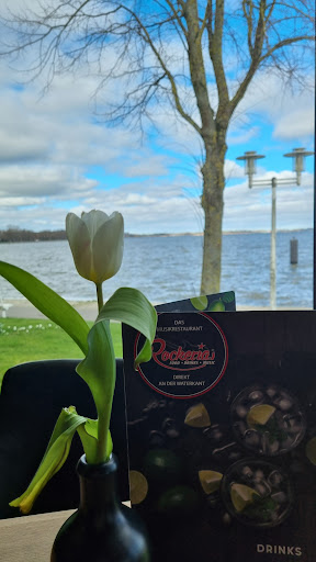 Read moreWir waren hier zum Rockeria-Lunch am Sonntag um 12 Uhr. Ich finde es schade, dass es auf der Website keine richtige Darstellung des Lunchs gibt, daher einmal eine Beschreibung dessen, was einen erwartet: Es gibt ein Vorspeisenbuffet mit Brot, Butter, Salat, Tomate-Mozzarella und Nudeln mit Pesto. Das Hauptspeisenbuffet besteht aus Twistern, Kartoffelspalten, Spare-Ribs, Chicken-Wings und Schnitzel. Zusätzlich kann man sich pro Person wahlweise Nudeln mit Pesto (siehe unten!!) ODER einen Cheese-Burger bestellen. Als Nachspeise gibt es kleine Küchlein, Schokoladencreme und Früchte. Die Vorspeisen bieten jetzt keine besonders große Vielfalt, aber sind absolut ausreichend. Bei den zu bestellenden Hauptspeisen wurden wir nicht genau genug darauf aufmerksam gemacht, dass man sich wahlweise nur eines der beiden Gerichte bestellen kann, was schade war, weil es die Nudeln mit Pesto kalt auch schon bei den Vorspeisen gibt. Diese sind meiner Meinung nach im Übrigen wirklich schlecht. Wie man auf dem Bild sehen kann, schwimmen die Nudeln in Fett. Für mich sehen Nudeln mit Pesto ganz, ganz anders aus... und geschmeckt haben sie mir auch nicht. Die Burger waren gut, der Bun war jedoch steinhart, was ich so nicht kenne. Bei dem Buffet waren die Twister und die Kartoffelecken immer schön frisch, heiß und knusprig. Auch die Fleischgerichte haben gut geschmeckt, jedoch fehlte mir hier der Pfiff. Die Spare-Ribs waren einfach mit Barbecue-Soße übergossen, zumindest sah es so aus und schmeckte auch so. Tendenziell hätte ich das zuhause alles auch so hinbekommen und eigentlich erwarte ich in einem Restaurant immer sagen zu können, dass ich das Zuhause so nicht hinbekommen hätte. Da wurde ich enttäuscht. Die Nachspeisen waren super lecker! Ein besonderes Highlight ist auch, dass diverse Getränke inklusive sind, jedoch ist hier auch zu differenzieren: unter Fassbier wird hier nicht auch das Störtebeker-Fassbier verstanden und beim Wein gibt es einen Chardonnay (nicht den aus der Karte, sondern eine günstigere Variante, der auch nicht gerade optimal gekühlt ist, sondern eiskalt serviert wird) oder einen Rotwein. Am Buffet gibt es Wasser, Säfte, Tee und Kaffee, was ich besonders gut finde. Der Service war recht gestresst, was für mich aber erstmal nicht schlimm ist. Allerdings wurden wir nie gefragt, ob wir noch etwas neues an Getränken möchten, sondern mussten uns darum selbst kümmern, was aber an sich auch kein Problem ist. Und unschlagbar ist natürlich der Ausblick! Unbedingt einen Tisch am Fenster reservieren! Insgesamt für mich ein leckeres Essen, bei dem mir jedoch das Besondere fehlte, das ich bei einem solchen Preis eigentlich...
