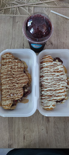 Zuerst habe ich die Putenbrust Waffel verkostet: Die obere Waffel war überreichlich mit Sauce bedeckt, sodass man sie mit den Händen verspeisen wollte, denn Besteck schien bei einem solchen Mahl arg fragwürdig. Meine Hände wurden arg befleckt. Die Waffel war von normaler Größe und befüllt mit Tomaten, Salat, Sauce und Röstizwiebeln. Obwohl es recht köstlich war, waren die Röstizwiebeln ungleichmäßig verteilt, nur am Rand der Waffel zu finden. Zudem war der Preis recht hoch. ⭐⭐