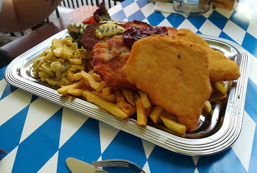 Wir wollten eigentlich Münchner Schnitzel bestellen, weil wir das früher (bei Maria)immer so gerne gegessen haben. Aber dann haben wir das Schnitzel, das anderen Gästen serviert wurde, gesehen und uns spontan für Schweinebraten entschieden, denn das Schnitzel wurde in der Friteuse gebacken - mit einem Berg Pommes dazu. Jedoch diese Entscheidung war auch nicht die beste: Es war eine Riesenportion mit zwei großen Knödeln, was ja zunächst positiv erscheint, a b e r : das total trockene, zu Tode gebratene Wammerl wabberte in einer undefinierbaren Soße mit unappetitlichen Eiweißflocken darauf. Kruste gab es keine, dafür lag es zu lange in der Soße. Den Semmelknödel konnte ich gar nicht essen, weil er mir überhaupt nicht geschmeckt hat, wahrscheinlich ein Fertiggericht aus dem Beutel, ebenso der kaugummizähe Kartoffelknödel. Zur Krönung hat man dann noch vom Mitbraten des Fleisches zerkochte Karottenstücke, die ganz braun waren, mit auf den Teller gelegt, was vollkommen sinnfrei war, weil die ebenso gruselig waren wie alles andere. Die zwei Sterne sind für das Ambiente und den Service, für die Küche kann ich keinen Stern vergeben. Schade - denn der Biergarten ist wirklich schön, aber wenn sich in der Küche nichts ändert, sehe ich (wieder mal) schwarz...