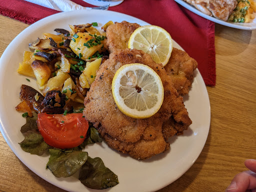 Eine einfache, bürgerliche Küche ohne großen SchnickSchnack. Der Clou ist die Schnitzelkarte: Ein großes Schnitzel in mehreren Variationen zu 7,50, zwei zu 10,50 und dann gibt es sogar noch die Möglichkeit, dass man drei Schnitzel nimmt. Da weiß ich aber den Preis nicht mehr. Auf dem Bild von mir ist allerdings das Schweinelendchen Hubertus - also mit Pilzsoße und Kroketten zu 14,50