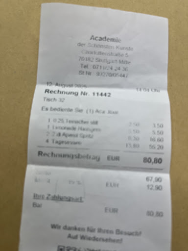 Read moreNoch nie erlebt!!! Am 12. August 2025 habe ich meine Gäste aus USA in mein sonst liebligns Restaurant Akademie eingeladen. Es war gegen Mittag und wir haben einen Platz im Garten gesucht. Es hat eine Frau (Dame kann ich sie leider nicht nennen) draußen bedient. Sie hat uns einen Platz zugewiesen, ich habe nach einem anderen gefragt, der scheinbar reserviert war. Ich sagte, halb im Scherz dass uns der angebote Platz nicht so ganz gefällt. Ihre Antwort war, ganz im Ernst und in einem sehr unfreudlichen Ton, wenn es euch nicht gefällt, könnt ihr weiter gehen! Wir haben kaum geglaubt was wir gehört haben, dann haben wir uns für den angebotenen Platz entschieden. Daneben hat sich ein Mann mit einem großen Hund gesetzt. Der Hund sah freundlich aus und war neugirig auf uns. Das Essen haben wir bestellt. Als die Frau mit den Tellern mit Suppe kam, hat der Hund sein Kopf gestreckt und seine Schnautze fast in die Suppe gesteckt, auf jeden Fall hat er drauf geschnauft. Das kann wohl gesundheitlich schlecht sein. Ich habe automatisch zu Bedienung gesagt, passen Sie auf! Dann kamen von ihrer Seite laute und fast beschimpfende Worte. Wütend wollte sie uns einen anderen Tisch aufdecken, wir sind doch bei gleichem Tisch geblieben. Ich und meine Geste konnten das kaum fassen. Weder wir noch sie haben so was in der ganzen Welt nicht erlebt. Für mich ist das eine große Enttäuschung und ich werde sicher nie mehr in der Akademie sitzen wenn ich sehe, dass diese Frau da arbeitet. Unsere jahrelange Erfahrungen mit allen anderen Kellnern dort waren sehr gut, sogar überdurchschnittlich gut. Umso grösser die Enttäuschung. Auf der Quittung: es bediente sie: aca jour. Falls das dem Besitzer ein Hinweis sein kann, wäre gut. Ich behalte mir noch vor, mich direkt beim Ladenbesitzer direkt...