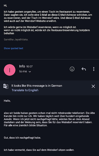 From the start, the communication was confusing — sometimes I was told to reserve at the restaurant, sometimes at the “Weindorf.” I stayed polite throughout, clarified details several times, and even complimented the staff for their help.