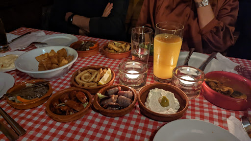 Although we did our best to find out why the restaurant was Spanish in writing only, the noise level was very high. We asked the server to send us the owner, who then explained the complicated history of the restaurant with old and new cooks and changes in management and encouraged us to try the patatas bravas and the boquerones, neither of which was very good: the potatoes were greasy and the anchovies tasted fresh from the jar.