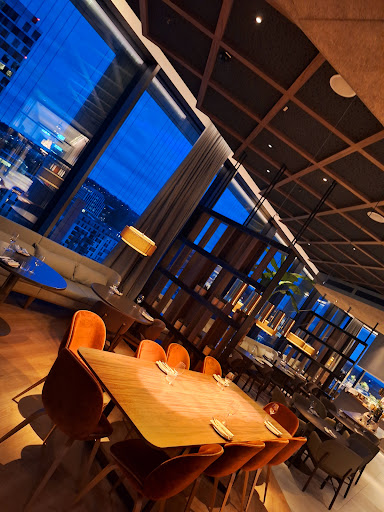 Wenn man auf die Toilette muss: es gibt keine auf dem Stockwerk des Restaurants. Man fährt mit dem Aufzug ein Stockwerk tiefer. Geht durch mehrere, sehr schwere Türen und landet zwischen Konferenzräumen auf Toiletten, die eher zu den Konferenzräumen passen als zur Preislage des...