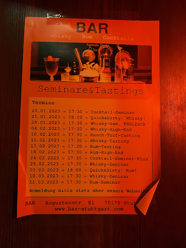 Read moreDie "BAR" ist eine inhabergeführte Institution des guten Geschmacks in Stuttgart-West. Wer der Mojitos, Caipirinhas und anderen Standard-Panschereien, die man allerorts in der City bekommt, überdrüssig geworden ist, erfährt hier erfrischende Neuigkeiten und echte Klassiker in einem sehr gemütlichen Rahmen. Ausgewählte Whiskys und auch (Flaschen-)biere runden das Angebot ab. Die Preise sind recht hoch, aber bei der hohen Qualität der Drinks und der (wenn gewünscht) sehr kompetenten Beratung durchaus gerechtfertigt. Erwähnenswert auch die meist hervorragende Musikauswahl, die immer unaufdringlich, aber dennoch hörbar durch die Bar "swingt", "jazzt" und "bluest". Wer rauchen möchte, muss hier nicht "vor die Tür" gehen, sondern kann sich in die kleine, gemütliche Ecke zurückziehen und in den lümmeligen Sesseln versinken, aus denen man auch als Nichtraucher ungern wieder aufstehen will. Großes Manko: die Chancen auf einen offiziellen Parkplatz sind gleich Null - aber wer hier mehr als zwei Stunden verbringt und etwas Geld locker machen kann, sollte das Auto sowieso nicht...