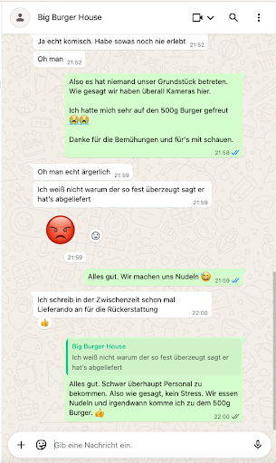 Das, ist kein Kundenservice. Bei einer Bestellung die knapp 55min. Zu spÀt ankam, kann man doch zumindest ein freundliches GesprÀch erwarten und kein genervtes Antworten eines Restaurantbesitzers.