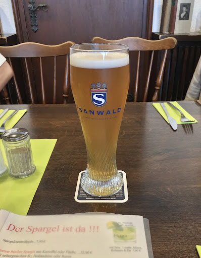 Its a very traditional Swabian biergarten. I enjoyed my dinner here. For beer, I think they have a few on offer, but the specialty is yeast wheat ale and that’s what I got. It was a really lovely beer - my only complaint is that others at the table got twice the amount of foam on top that I got. For food, they have a main menu of all the typical Swabian biergarten foods and but there are also seasonal specials. Right now it’s asparagus and strawberries in season, so they were featured prominently. I had a dish of asparagus with crepes and hollandaise, which was very memorable! The asparagus was cooked to this almost creamy consistency while still maintaining the brightness of fresh vegetables. The crepes were buttery and flaky. I don’t get why it was so expensive though - it was €22 which was more expensive than most of the meat dishes on the menu and it was just a normal-sized dinner. We were in a huge group that reserved the whole restaurant, and for the most part the staff sufficiently managed the big group. There wasn’t too long a wait to order and our food came out in a...