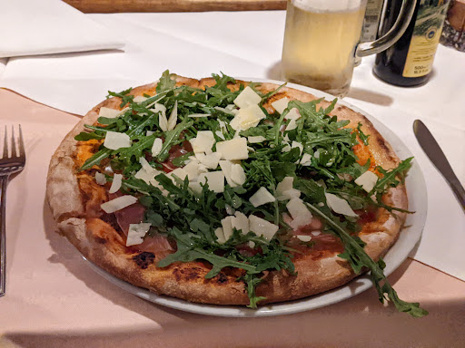 Walking up the sidewalk to the entrance, we actually turned around to look for another door because the entryway didn't look like the entrance to a restaurant. Cluttered with beer cases, an old office chair, and other junk. Not inviting at all. Unfortunately, the friend who ordered the steak requested it be cooked medium-well and it was almost rare. The pizzas were obviously sitting out of the oven for a little while as the rest of our group's food cooked as they were lukewarm when they reached our table. The service was honestly terrible. Once our group finished our meals, we waved the waiter down to pay. Ten minutes pass, we wave him down again. He acknowledges us both times. After twenty five minutes, he's STILL palling around with the neighbor table while we're ready to leave. Flagged another waiter down and he says you can only pay the boss (???). We waited almost half an hour just to pay. Very frustrating. And when we used the restroom before leaving, it was filthy. Don't think we'll be returning despite the...