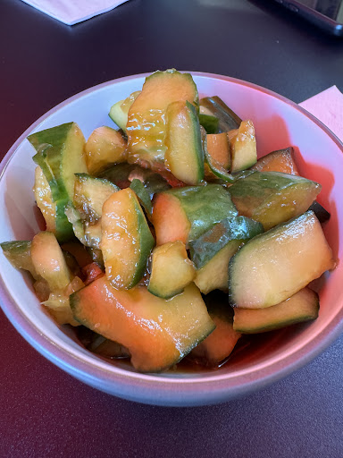 Because it was so hot, we also ordered the cucumber salad. It did not come with any chili as shown on the menu, so we added chili oil to it.