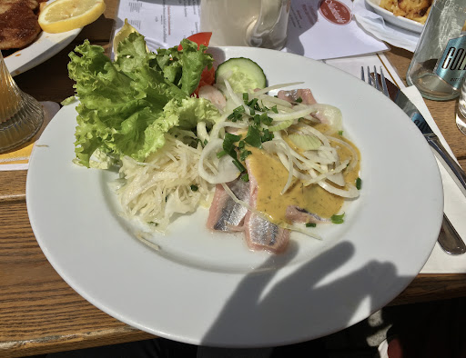 We visited this place for lunch. There were 8 of us and they pushed two tables together outside to accommodate us. The patio gets lots of sun which is very pretty but got a little hot. I had the Matjes Nordisch (pickled herring with dill-honey mustard sauce, with cabbage and a side of fried potatoes. The matje fillets were really good - the flavour wasn't too "fishy" or pungent, and the sauce was very tasty. There was an assortment of fresh vegetables (lettuce, tomatoes, cucumber, endives) on the side for garnish which I really liked. Very tasty dish with the cabbage. The potatoes were served separately and were also very well prepared. Very filling portion and the price was appropriate. The food was slow to arrive, even considering we were a big group. There was also some confusion as to how we could pay. We saw others getting their bills brought to their tables, but we were told we had to go inside, but then there was no one to help us inside for a while, and we had to stand in the way of the wait staff while we were trying to get someone's attention. In general, we felt all of the wait staff was a little rude to us. Maybe it's worth dealing with for the good food and nice location, but there are so many Swabian restaurants around that I can't imagine it would be difficult to find something that combines good food with...