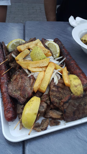 Er Spießt seinen Gyros selbst kein Fabrikschrott. Legänder seine Suwlakia oder Bifteki gefüllt mit Schafskäse. Auch frisch gegrillter Schweinbauch oder auch anderes gegrilltes. Nicht zu vergessen griechisches Bier oder Retsina und Ouzo oder tsipuro. Aber auch Soft Getränke aus Griechenland. Oder nur ein einfacher Griechischer Bauenrsalat oder ein leckerer Krautsalat. Auch sein Zatziki oder Chtipiti ein muss.