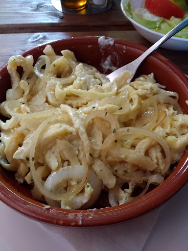 Die zwei Handvoll Käsespätzle waren lauwarm und völlig ungewürzt, was in Kombination mit den fast kalten Schmelzzwiebeln nicht gerade einen Genuss darstellte. Der Käse wirkte etwas krümelig, als sei zusätzlich Rührei hineingearbeitet.