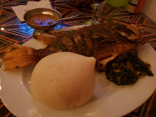 Then our food came, the Tilapia was huge 🥰. I couldn't finish the whole thing and had to have it to go. I ordered it with plantain. My Husband had the Eru with Fufu.