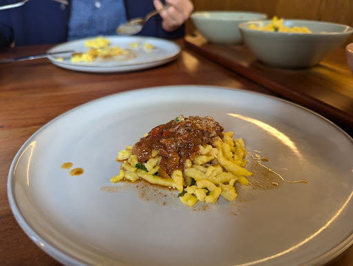 We enjoyed a wonderful lunch time! We ordered Zwiebelrostbraten and Rindergulasch, and the drinks were Riesling and Trollinger Weißherbst. Both main dishes came with a side of their homemade pasta, which was delicious when paired with the main courses, giving a feeling of Western beef noodles, almost like a type of Italian pasta, but perhaps it doesn't need comparison with other things; it is simply a hearty and delicious meal, highly recommended to everyone. The staff welcomed us with smiles while taking our orders and kindly introduced and confirmed the dishes; the plates were beautiful and perfect for gathering with friends we haven't seen for a long time....