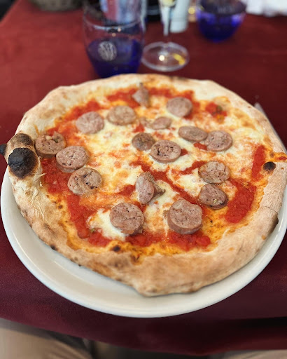 The pizza was good overall, with a well-cooked crust and a tasty tomato base. However, the salsiccia (sausage) slices were not aesthetically pleasing, which detracted from the visual appeal of the pizza.