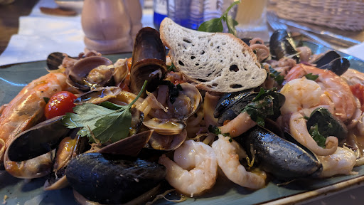 What a lovely evening. This is the new star in the Dachswald restaurant Corner. Wonderful cozy atmosphere, and a bit like in an italian mountain hut, but somewhere close of lago di Como, aber lago di Garda, but 'german cleanliness' and Italian cuisine. I enjoyed the variety of seafood combined with standard dishes like spaghetti aglio olio. Highly recommended for a decent evening and a nice walk...