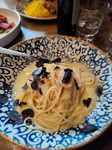 From a taste point of view, all the cooked dishes were not salted enough, and my parmesan pasta with truffle was soaked in water (see picture). The osso buso and pizza were good. The bacon in the spaghetti alla carbonara were slightly under cooked leaving an unpleasant raw porc fat taste in the mouth. The coldcut and cheese were good. The Terrapiebo Primitivo wine was very good (see picture)!