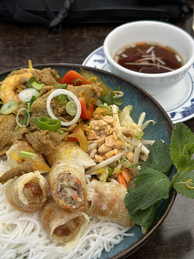Landed in Stuttgart after some crazy weather, we were craving something soupy and comforting. We came across this little joint, which we didn’t know was a 2 story place. It looks more decorative and cozy upstairs with a cute bartender working upstairs. I had Bun Bo Hue, cafe sua da ( Vietnamese coffee with condensed milk -iced) and Bò sốt vang ( I had no idea what it was until it came out, it was Bò kho ( which is beef stew is what Im known it for )the meat was a little tough and hard to chew. Bun bo Hue was good, missing a few ingredients here and there but it’s doable if you want a hot spicy soupy beef dish- worth the try. I also had cafe sua da and it was only ok to me. It might’ve tasted a bit different for me as far as the coffee , a bit powdery for my after taste. Overall nice experience. We’ll definitely come back to try the rest...