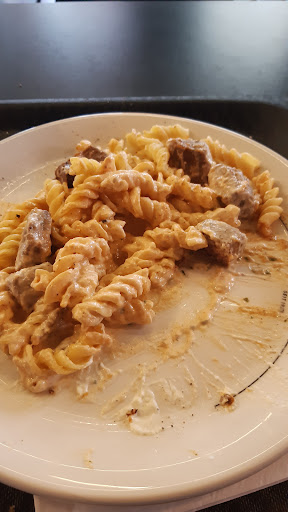 Einmal das Tagesessen bestellt (Nudeln mit Gulasch). Ich erhielt eine lieblos auf den Teller geklatschte, lauwarme Mahlzeit. Die Nudeln verkocht, das Fleisch trocken die Gulasch - Soße nur in Spuren wahrnehmbar. Stattdessen war das ganze Gericht von einer undefinierbaren, angetrockneten Fettschicht überzogen (wohl sowas wie Creme fraiche?). Gut dachte ich mir, vielleicht reißt es ja der Geschmack raus. Nein, die Enttäuschung setzte sich fort : Das Gericht war weder gewürzt noch gesalzen, für mich ungenießbar und das für unverschämte 8 Euro 50! Passend dazu der Tischaufsteller (siehe Foto) ^^ Die harten, unbequemen Sitzgarnituren rundeten dieses Negativerlebnis passend ab.