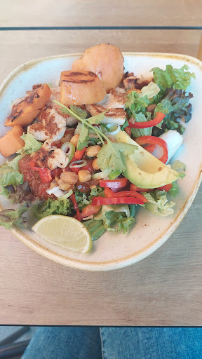 Read morePositiv zu erwähnen ist, dass es planted chicken gibt. Ich kenne Beaper nur so, dass sie sich deutlich bemerkbar machen. Hier leuchten sie nur dezent grün, was an einem Tisch draußen in der Sonne kaum wahrnehmbar ist. Hier hätte ich mir bei der Bestellung einen Hinweis gewünscht, so dass man darauf achten kann. Mein Curry war dann leider nur noch lauwarm, die Falafel komplett kalt. Beim Curry habe ich die leckeren Aromen vermisst, die in diesen Gerichten eigentlich sein sollten. Es war sehr neutral und lasch. Die Süßkartoffeln und der Spinat waren jedoch gut. Die Mini Falafel Plate war sehr lieblos angerichtet. Optisch sah es aus, als hätte man die Rohkost einfach nur auf den Teller geschmissen. Das reisst auch ein Hummusbällchen nicht raus. Die Falafel waren okayish. Warm wären sie vielleicht sogar gut gewesen? Ich glaube man ist hier mit einer Salatbowl besser bedient. Die freundliche Mitarbeiterin an der Kasse schien vollends überfordert. Neu? Natürlich muss dann jeder lernen, aber es schien keine wirkliche Einarbeitung gegeben zu haben, denn es hat schon an den...