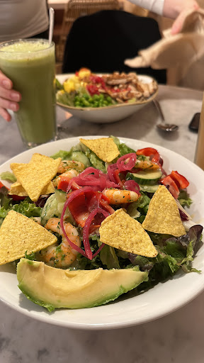 Read moreIch habe aus meinem Umfeld viel Gutes über Dean&David gehört, von daher dachte ich, probiere ich es mal aus. Habe mir einen Salat bestellt und musste Conronabedingt draußen warten, was absolut ok ist. Zu der Bestellung bekommt man ein Gerät, welches vibriert, wenn das Essen fertig ist. Da ich nach 20min allerdings immer noch keinen Salat hatte, habe ich nachgefragt wo er denn wäre. Der Salat stand auf der Theke und als ich die Dame drauf angesprochen habe, meinte sie nur, dass das Gerät wohl kaputt wäre. Keine Entschuldigung, nichts leider. In dem Fall, finde ich, müsste man mal gucken gehen, wieso der Gast seine Bestellung nicht abholt. Ich habe den Salat zum Mitnehmen bestellt, leider gab es weder Besteck noch eine Serviette dazu, wie ich finde, kein guter Service. Und auch die Größe des Salates ließ zu wünschen übrig. Wenn man sich die Teller anschaut, die vor Ort serviert werden, freut man sich richtig drauf. Aber das was man bekommt, wenn man es mitnimmt, ist ein Witz bzw Frechheit für den Preis.