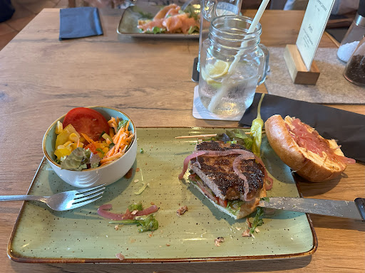Read moreGrundsätzlich eine schöne Location, bei vielen Gästen finde ich es nicht mehr sehr angenehm. Die Bedienung war nicht wirklich gut. Scheinbar bemüht aber im Umgang mit Kunden offensichtlich überfordert. Vorspeise überbackene Nachos, hier viel zu wenig Käse - laut Bedienung kein Käse mehr da. Ja und nun? Wieso keine Info aus der Küche? Danach Burger - es ist optisch gewollt aber nicht richtig gekonnt. Eine weitere Bewertung sagt es richtig: Es liegt halt eine Bulette da auf dem Burger. So fühlt es sich wirklich an. Auf dem Bild fehlt schon der Teil, wo kein Fleisch dabei war. Einfach ein zu kleines Hackteil. Dann lieber etwas flacher aber überall Fleisch. Die restlichen Beilagen hat man leider nicht richtig raus geschmeckt. Grundsätzlich nicht völlig daneben aber ich würde den Burger des Hauses so nicht mehr bestellen. Wir haben auf Getränke und Essen relativ lange gewartet... Gut: bei Bestellung ohne Pommes oder sowas gibt es (wie auf dem Bild zu sehen) einen ganz kleinen Salat. Positiv! Eine Begleitung hatte Räucherlachs auf Rösti - hier für das Geld zu wenig Essen. Wir haben keine großen Ansprüche bei der Größe der Mahlzeit, aber hier einfach zu wenig. Ein Essen nicht für Kinder oder Vorspeise. Ich denke hier würden viele mit Hunger vom...