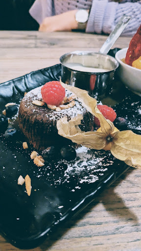 Als krönenden Abschluss habe ich mir den halbflüssigen Schokokuchen mit Mango-Ragout und Vanillesauce gegönnt. Der Kuchen war warm, schokoladig und genau im richtigen Maß flüssig. Die süße und fruchtige Mango harmonierte perfekt mit der herben Schokolade, und die Vanillesauce rundete das Dessert ab, indem sie alles zu einer geschmacklichen Symphonie vereinte.