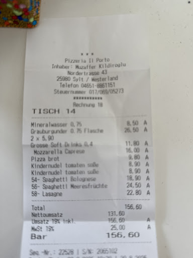 Wir hatten gedacht das dieses Restaurant bei soviel positiven Bewertungen von Sylt Bewohnern etwas tolles ist. Aber unser Eindruck war es nicht. Ein Tisch ohne Reservierung um kurz vor 18 Uhr war kein Problem. Toll dachten wir. Hund auch kein Thema. Also nahmen wir den Tisch in der hinteren Ecke. Die Sitzkissen waren arg dreckig. Sah aus als wenn jemand den Weg zur Toilette nicht geschafft hat. Stuhl getauscht. Unser Hund legt sich wie immer im Restaurant unter den Tisch. Nach uns kamen weitere Gäste. Alle wurden bedient. Wir haben gewartet. Dann kam nach einiger Zeit die Bedienung und brachte uns die Karten. Essen ausgesucht. Wieder ewig gewartet bis die Bestellung aufgenommen wurde. Essen kam und war leider eine Enttäuschung. Cappachio in Balsamicodressing ertränkt. Pizza war genießbar. (Aber absolut nicht den Preis wert). Nach dem wir den Chef auf die dreckigen Kissen hingewiesen haben fragte er ob das Essen geschmeckt hat. Mein Mann sagte ihm was nach unserer Meinung nicht ok war. Dieses tat er ab und sagte das man nicht auf alles achten kann was die Gäste machen, das die Sitzflächen/Kissen auch durch Hunde verunreinigt werden.??? Verstehe ich nicht, denn ein Hund gehört nicht auf einen Stuhl in einem Restaurant. Fazit: Wir kommen nicht wieder und können das Il Porto...