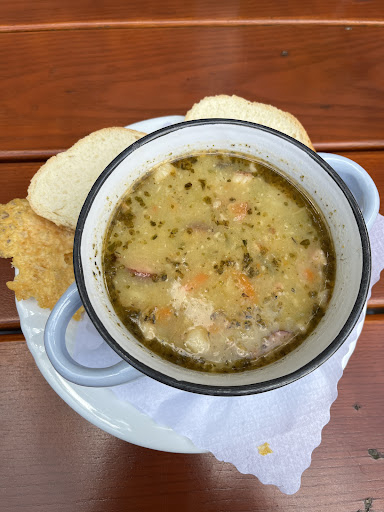 Ich selbst hatte eine Kartoffelsuppe vorweg bestellt und dann die Currywurst (ohne Pelle) …kam natürlich alles zusammen, so dass ich schnell Pommes und Wurst Futtern musste damit die Suppe nicht kalt wird…. Leute !!! Die Wurst war XXS Größe und mit Pelle pur !! Die Soße war im Leben nicht handmade …Und die Pommes waren lauwarm …..lediglich die Kartoffel Suppe war lecker wie immer !! Aber zu wenig um zu punkten bei 70 Euronen für 3 Personen