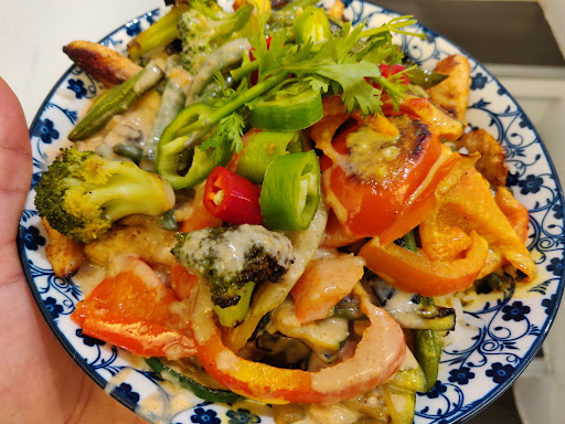 Read moreThere's a reason you have to wait in line around lunch time at this place, but no worries because the line moves fast. The food is quickly and deliciously prepared (though a bit on the salty side). Their Green Bowl (rice, green beans, veggie balls, chili, chives and peanut sauce) is tasty and fills up hungry bellies. Their prices (5.50 euro for vegetarian options, a bit more for meat) are very reasonable. The owner is simply a...