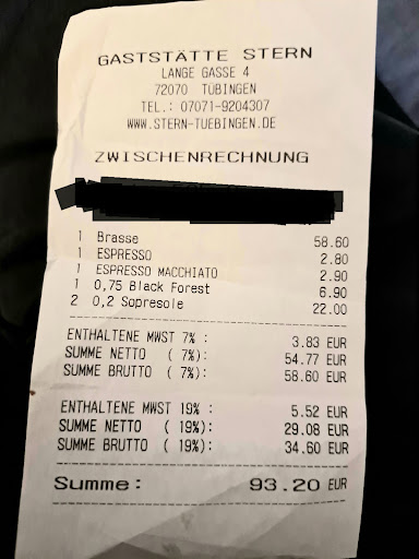 Wir waren heute dort zu zweit zum Abendessen. Am Ende haben wir 100€ (93,20 + Trinkgeld) gezahlt und sind leider noch sehr hungrig gegangen. Wir hatten (Text aus aus Karte): "Meerbrasse in Ganzem für 2Personen, Atlantik Kaltgewässer/Galizische Küste, Butterfly Schnitt/ 900g+, dazu Gemüse des Tages und Kartoffel vom Backofen, vorweg gemischter Salatteller für 2Personen 29,30 pro Person". Schon ein guter Preis, aber wenn die Leistung stimmt, ok. Leider stimmte die Leistung überhaupt nicht. Wenn mann 900g + schreibt, darf man nicht jedem nur ein mittleres Fischfilet servieren. Man sollte als Bedienung nicht bei der Bestellung sagen, dass es eine große Portion ist. Und was überhaupt nicht geht: Man darf für diesen Preis als Beilage für 2 Personen nicht nur 1 geschnittene Kartoffel, 1 geschnittene Karotte, 2 Scheiben Zucchini und 2 Löffel Blattspinatspinat servieren. Dass der Gruß aus der Küche augenscheinlich vergessen wurde, ok. Dass der Salat sehr sauer war, ok. Dass man für 2 Gläser 0, 2 Sopresole 22€ zahlt, ok. Aber alles in allem zusammen fühlten wir uns am Ende ziemlich veräppelt und vorallem hungrig (und nebenbei 100€ ärmer). Nachdem wir am Ende nachgefragt haben, ob evtl. versehentlich nur eine Portion für zwei Personen serviert worden ist, hieß es: "Nein, der Fisch ist fangfrisch und im Einkauf sehr teuer." Tja, das Gemüse war wohl auch fangfrisch. Ich habe mir jedenfalls nach dem Verlassen des Lokals in Tübingen auf dem Markt ein Bratwurstbrötchen gekauft. Kosten: 3,50....