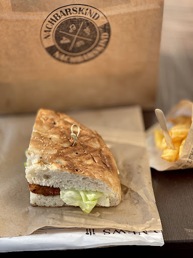 On request, there are gluten-free breads or vegetarian dishes, the total selection has grown in recent months by 2-3 additional, but there are not too many different dishes on the menu (which would then often only mediocre quality, some of you may know that from the 0815 delivery service around the corner perhaps?). I hope this continues to be as good as it is. The packaging is plastic-free, which I consider very positive for the whole pickup experience. The service is always very friendly, often the owner serves personally. I am remembered and I do not have to say every time again that I don't want ketchup on the fries - great! As for the individual dishes, here the tastes are certainly different, but the price-performance ratio certainly convinces everyone. I was often positively surprised by the fresh ingredients or the size of the portion. Unfortunately, it's no longer standard nowadays, but the Nachbarskind still has it, just like in the old days, when we never had to go home hungry. My personal recommendation for you would be the Crispy Chicken with lemon or the Schwabenflade. I've added a picture of it...